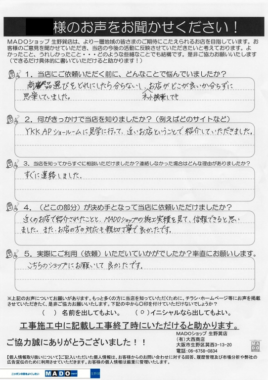 M様!この度は、MADOショップ生野巽店をご依頼をいただき、ありがとうございました。