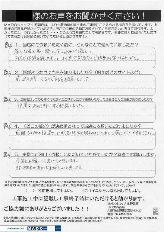 Y様!毎度、MADOショップ生野巽店をご依頼いただき、ありがとうございます。